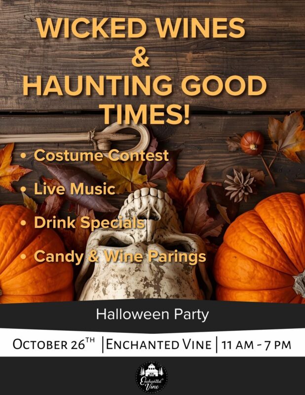 Get ready for a wickedly good time at our Halloween Party at Enchanted Vine! Dress to impress (or distress!) for our costume contest, groove to live music, and sip on themed drink specials crafted to thrill your taste buds. Indulge in our playful candy and wine pairing experience—because Halloween isn’t just for the kids! Gather your ghouls and join us for a night of spooky fun, sweet treats, and plenty of Enchanted Vine spirit.