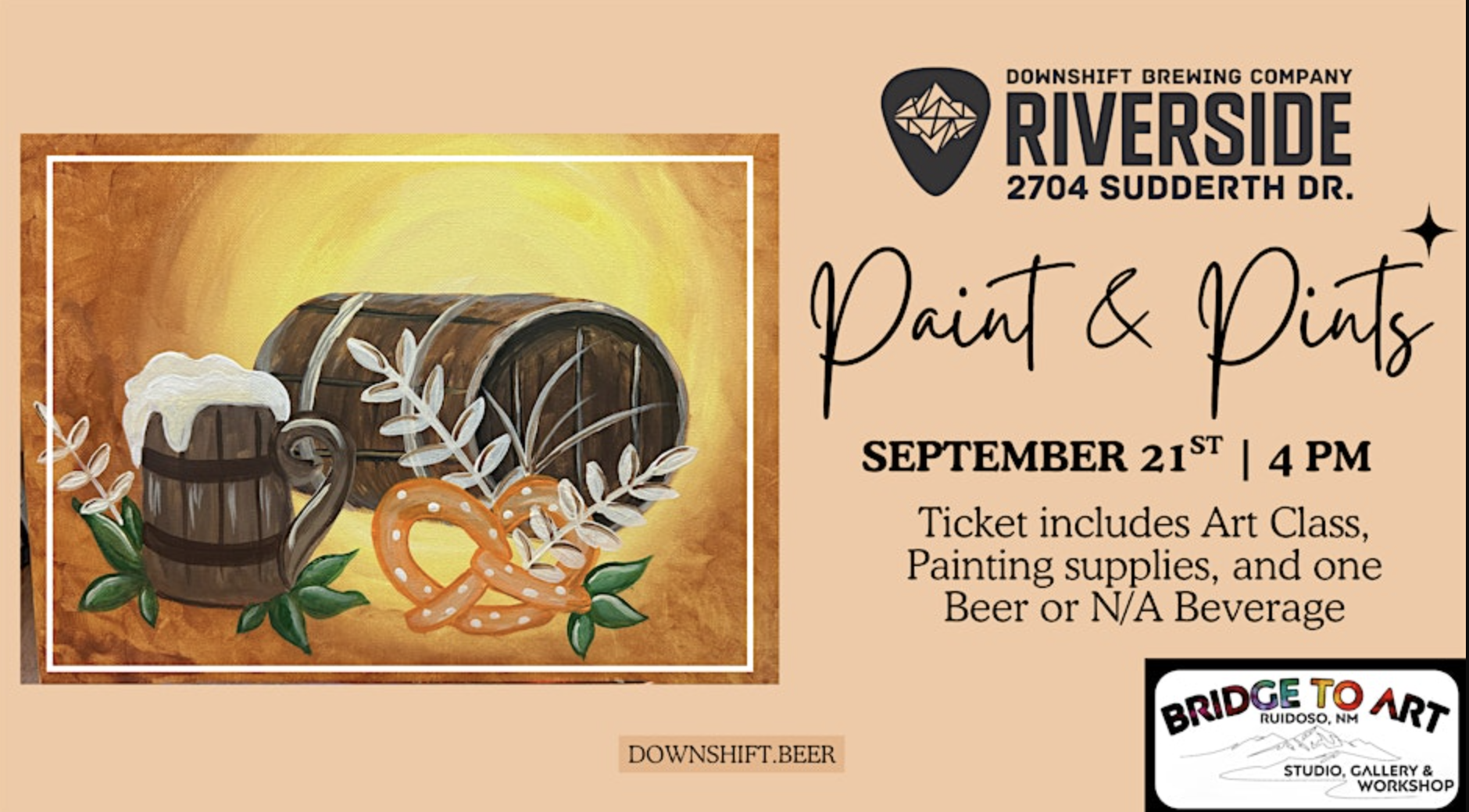 Join us at Downshift Brewing Company’s Riverside location on April 13th, at 4 PM for Paint and Pints night!