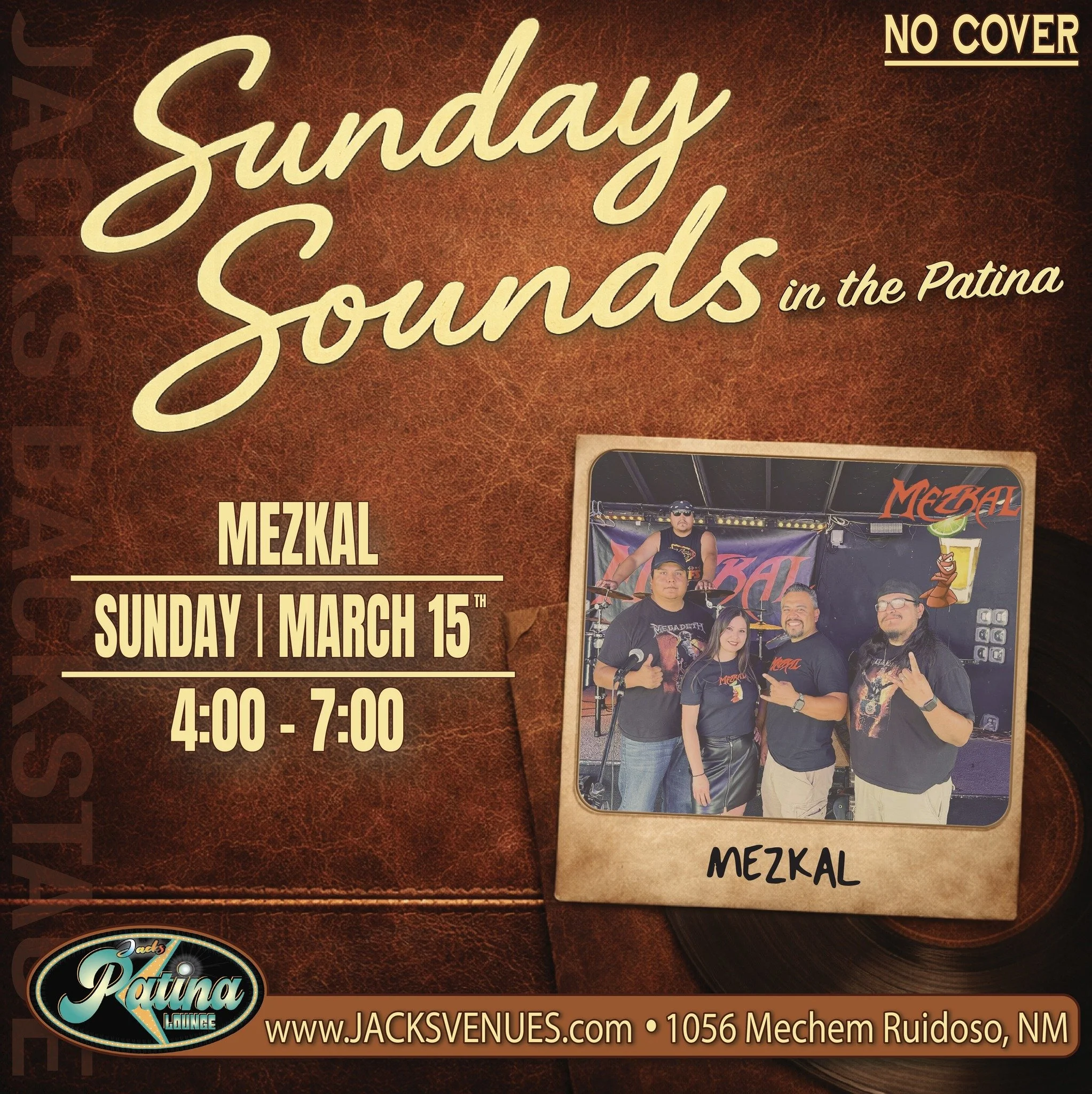 Breck Lindsey 02/11/2026 Sunday Sounds in the Patina: Mezkal Event Details Date: 03/15/2026 4:00 pm – 7:00 pm Venue: Jacks Backstage Categories: Local Happenings, Music Enjoy live music on Sundays at Jacks Back Stage in the Patina Lounge. Location: 1056 Mechem Drive Ruidoso, NM Source: https://jacksbackstage.com/events/